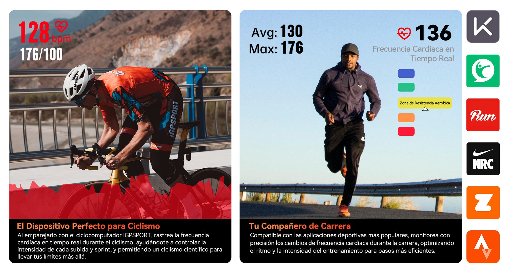 Registra desde 30 hasta 240 bpm con respuesta estable gracias al procesado AFE. Se empareja con ciclocomputadores, relojes y apps de entrenamiento mediante ANT+ o Bluetooth (puedes usarla con varias plataformas).